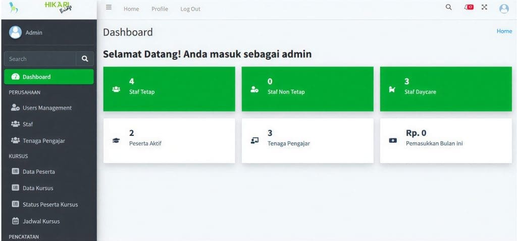 Dalam kegiatan ini, tim Abdimas mengimplementasikan HIBICO (Hikari Bridge Core), sebuah aplikasi berbasis web dengan konsep custom ERP system yang dirancang sesuai kebutuhan lembaga kursus dan daycare. Aplikasi ini memiliki berbagai modul terintegrasi, di antaranya pengelolaan pendaftaran siswa, pembayaran kursus, jadwal guru dan kelas, e-learning, manajemen pegawai dan pengajar, presensi dan penggajian, pencatatan pengeluaran lembaga, pengelolaan daycare dan kids club, serta penyusunan laporan keuangan berbasis standar akuntansi seperti jurnal, buku besar, dan laporan laba rugi.