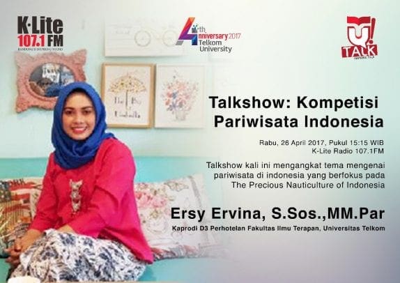 Kaprodi D3 Perhotelan Fakultas Ilmu Terapan Telkom University Ibu Ersy Ervina, S.Sos., MM.Par baru saja menjadi narasumber pada acara Talkshow di Radio K-Lite 107,1 FM Bandung. Pada acara Talkshow ini Ibu Ersy menyampaikan tema mengenai pariwisata di Indonesia. Pada acara ini disampaikan juga mengenai event Kompetisi Pariwisata Indonesia 2017 (KPI) yang akan diselenggarakan pada tanggal 17-19 Mei 2017. Kompetisi Pariwisata Indonesia (KPI) merupakan event kompetisi pariwisata nasional di kalangan mahasiswa yang diselenggarakan setiap tahun. Event ini diselenggarakan oleh Politeknik Negeri Bandung, Universitas Pendidikan Indonesia, Telkom University, STIEPAR YAPARI-AKTRIPA dan Sekolah Tinggi Pariwisata Indonesia. Acara tahun ini akan mengambil tema The Precious NautiCulture of Indonesia.